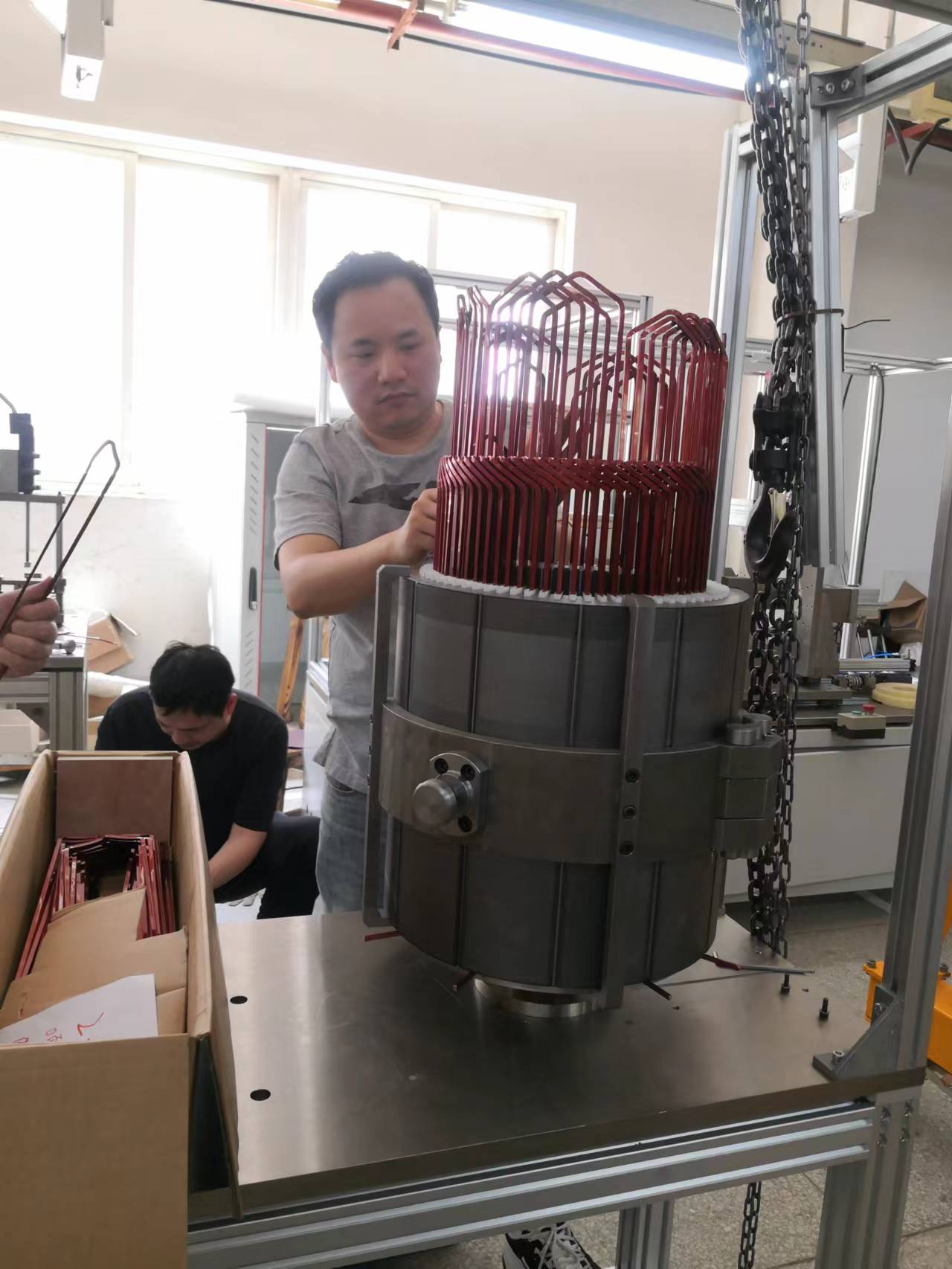 新能源大功率扁線電機定子產品制造進行時: 成功解決了大功率扁線定子多項制造工藝技術難題: 1、線長大于1米的扁線成型技術; 2、整體分線擴口技術; 3、八層粗扁線扭頭技術;